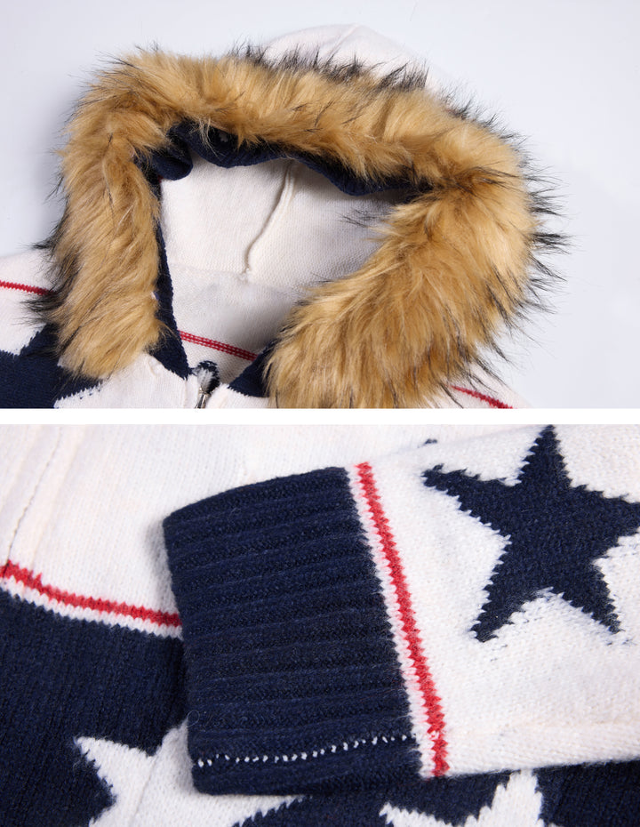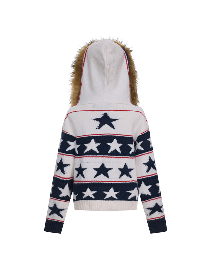 BAKYARDER Color-Block Striped Star Fur Collar Hooded Sweater Jacket