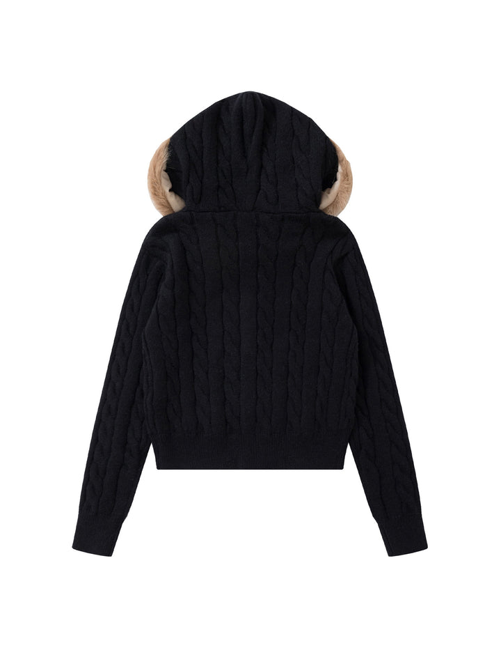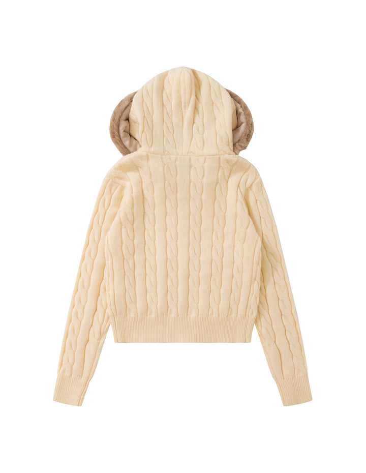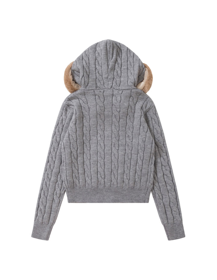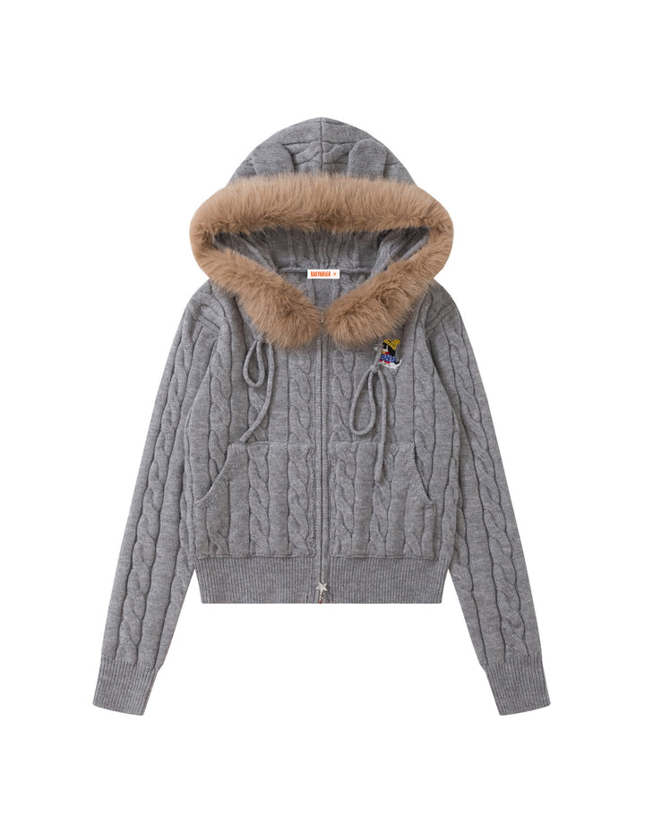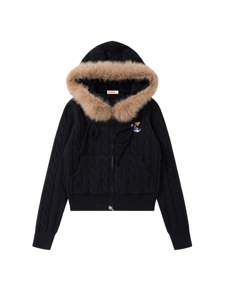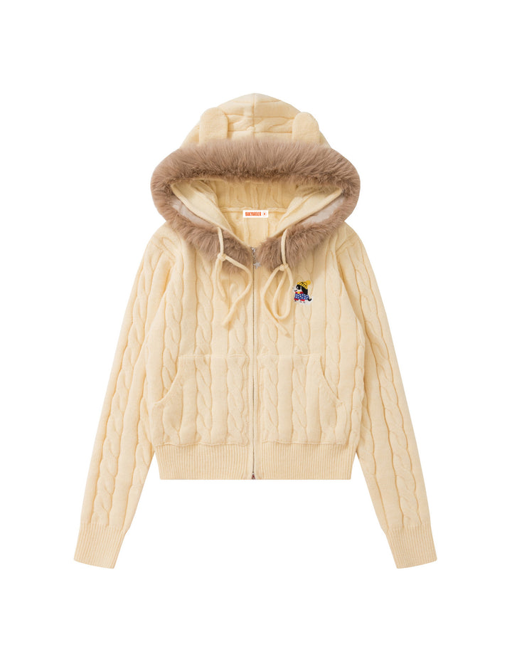 BAKYARDER Embroidered Puppy Fur‑Collar Hooded Zip‑Up Cardigan Sweater