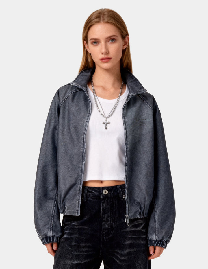 BAKYARDER Retro Distressed Stand Collar Leather Jacket