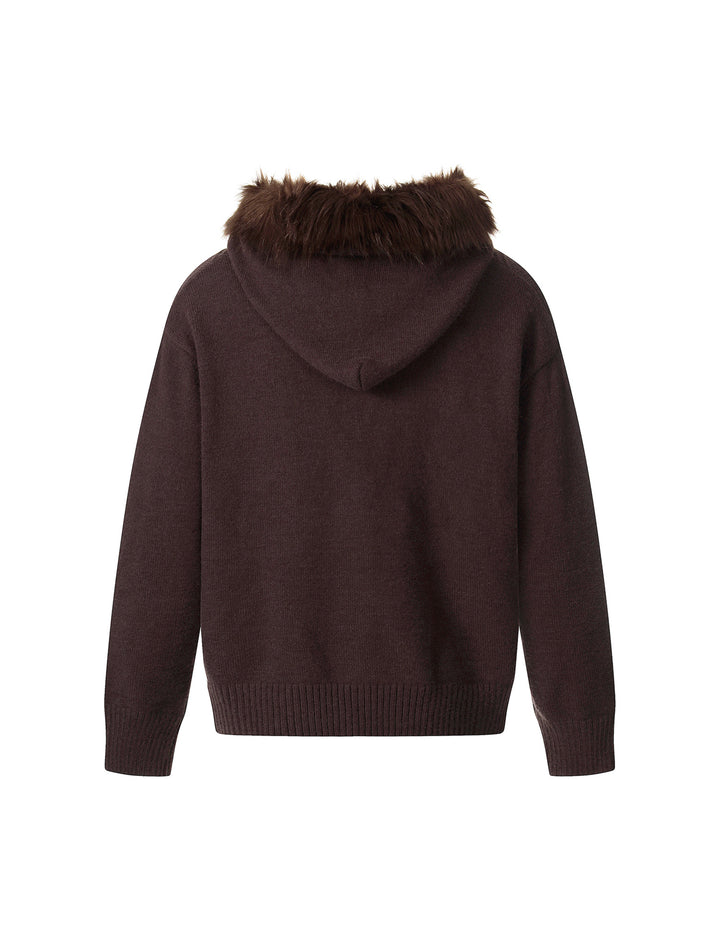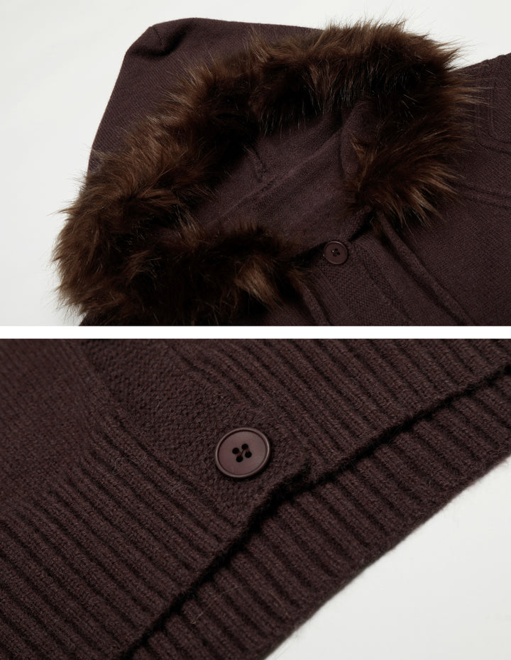 BAKYARDER Vintage Patchwork Fur Collar Hooded Zip-Up Knit Cardigan